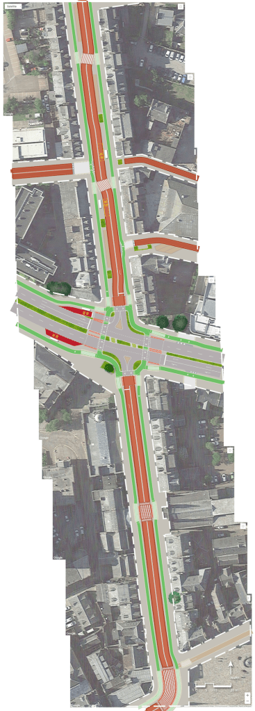 In second place is Christopher Wyatt with the following design. Christopher has included a bus gate on West North Street for his design. The idea for this is to prevent general traffic from making a right turn onto King Street while preserving access for buses and emergency vehicles. He’s also made use of floating bus stops. You can see Christopher’s full design here.