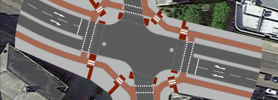 In second place is Christopher Wyatt with the following design. Christopher has included a bus gate on West North Street for his design. The idea for this is to prevent general traffic from making a right turn onto King Street while preserving access for buses and emergency vehicles. He’s also made use of floating bus stops. You can see Christopher’s full design here.