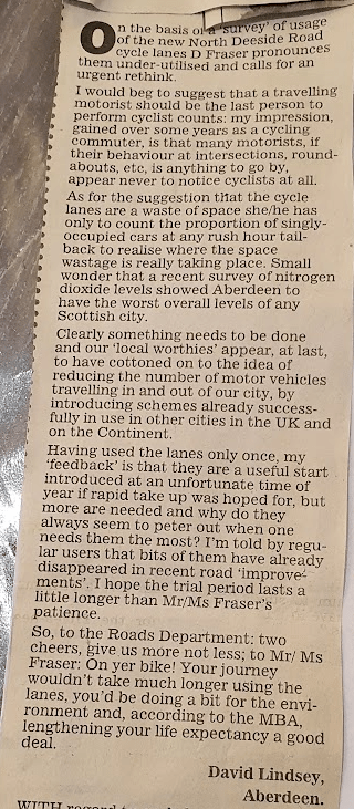 It isn’t rocket science, but it does need investment in a network of safe, segregated cycle paths where anyone and everyone can travel around safely. But we haven’t even got to the question of how to pay for it, because it seems in Aberdeen we don’t have politicians with enough imagination to even conceive what a city centre with a network of safe active travel routes would even look like. We had a segregated cycle path installed along the beach esplanade last year and it lasted barely two months before Councillors decided to rip it out again. A decision not informed by facts; no consultation, no statistics.